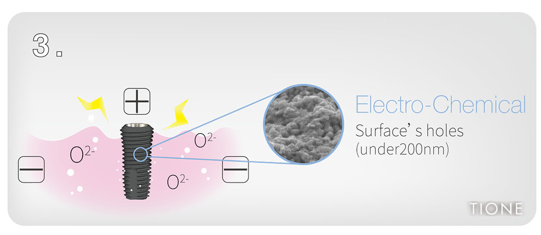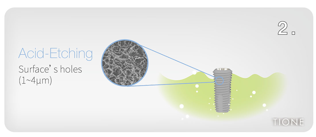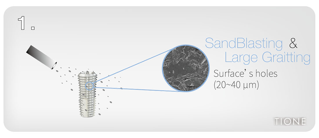 TIONE dental implant features a state-of-art SLAffinity® Technology, which leads to greater stability at initial stage and then faster Osseointegration. SLAffinity processes inherited the SLA surface treatment and then modified by three steps; 1. Sand-Blasting+Large Gritting(20~40µm)2. Acid-Etching(1~4µm) 3. ElectroChemical (200nm). This technology create the oxide layer on implant surface. In addition, it bring high Hydrophilic and faster Osseointegration benefit.